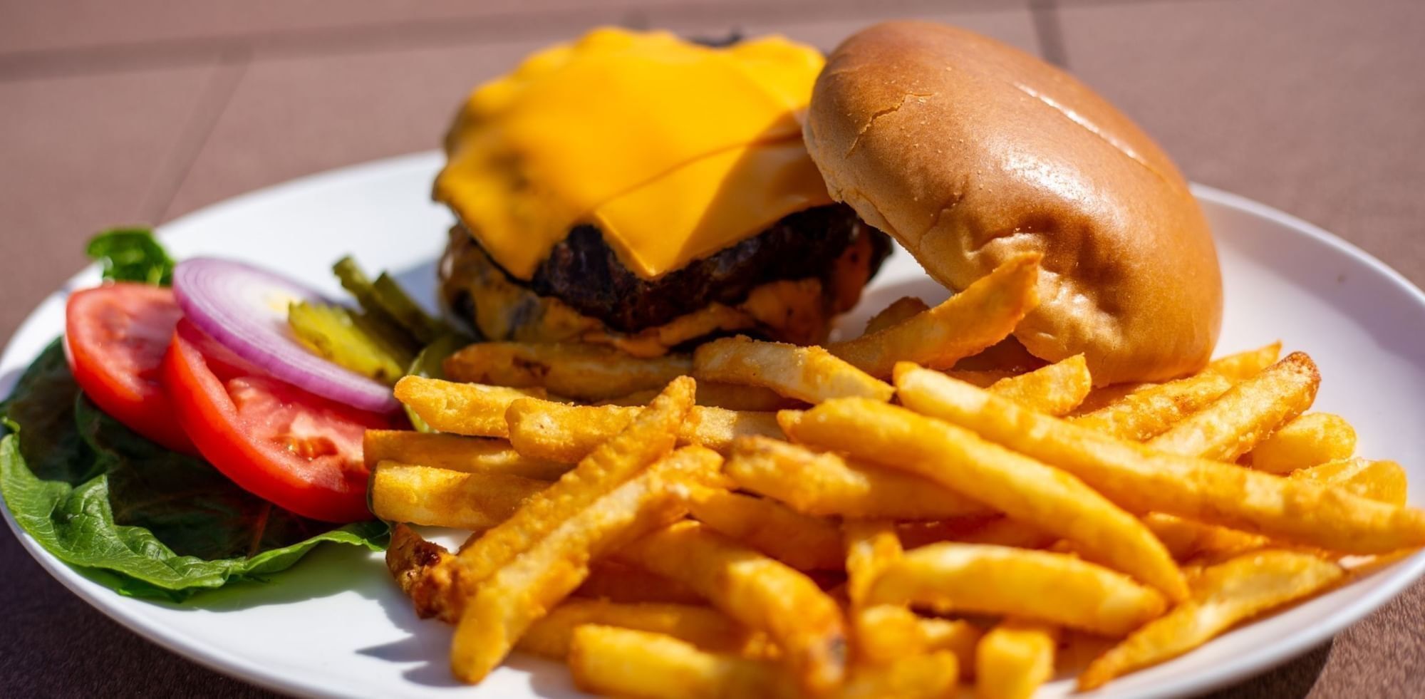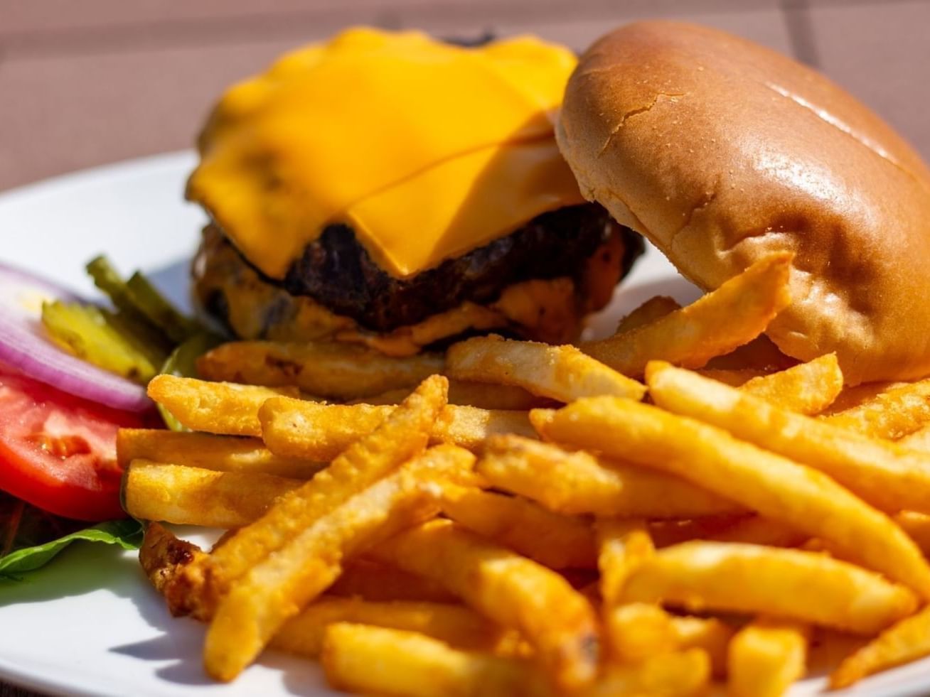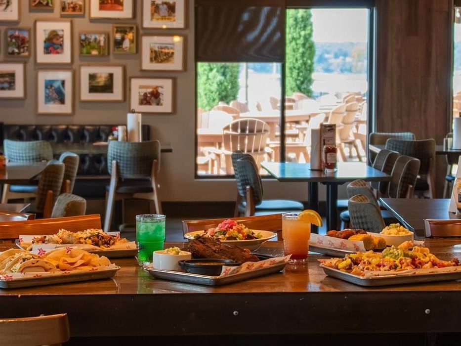 Enjoy American hand-held classics along with views of Grand Lake and the resort swimming pool.