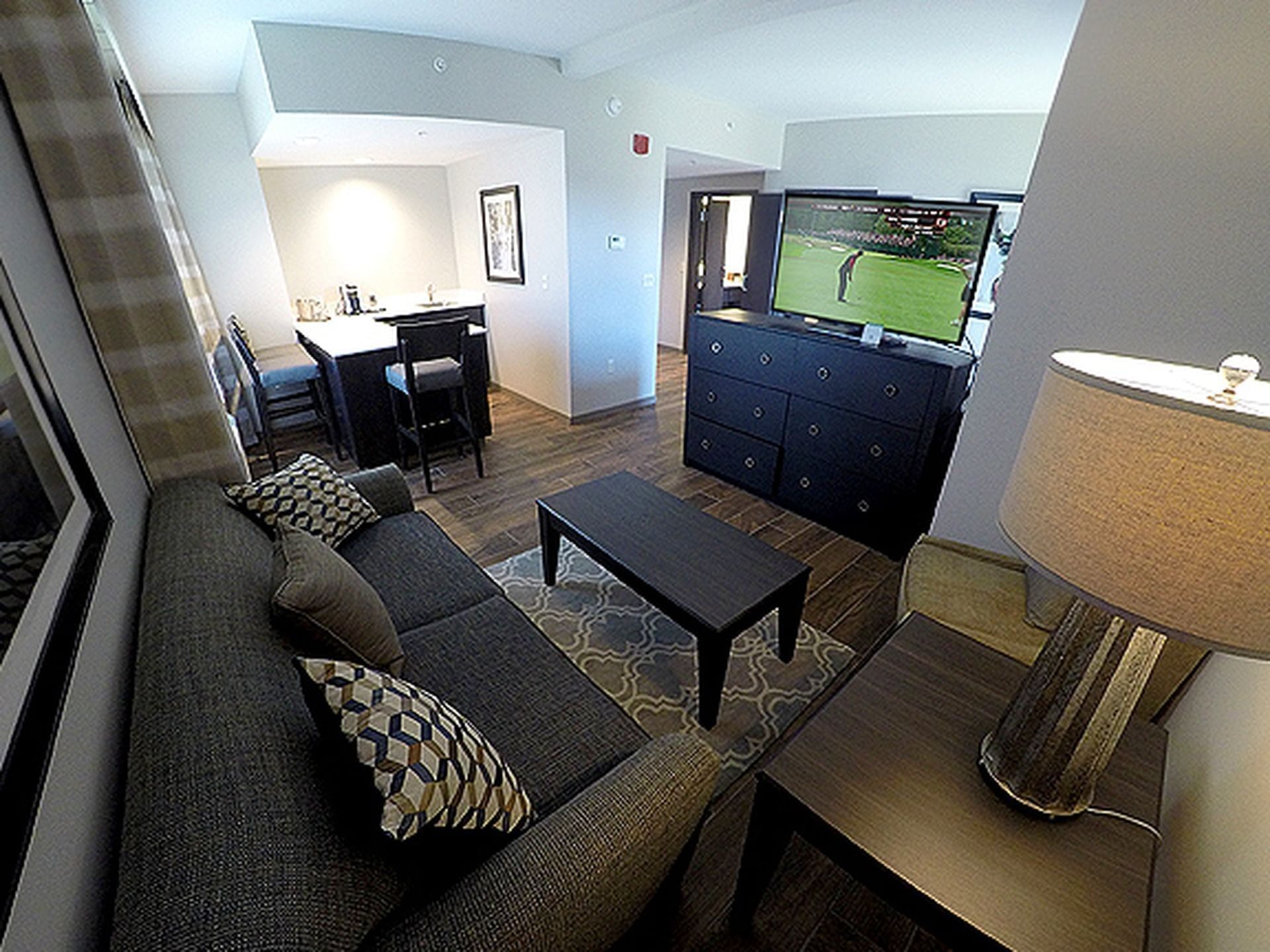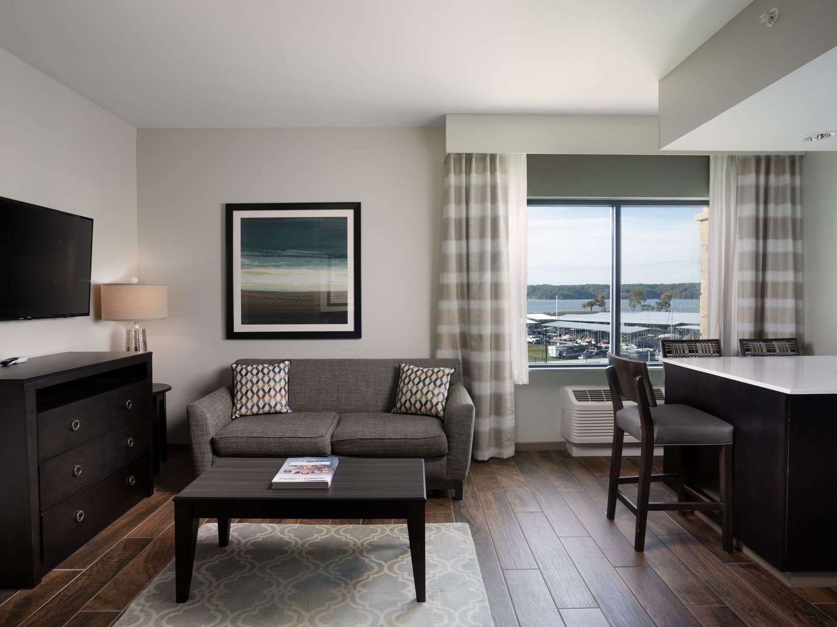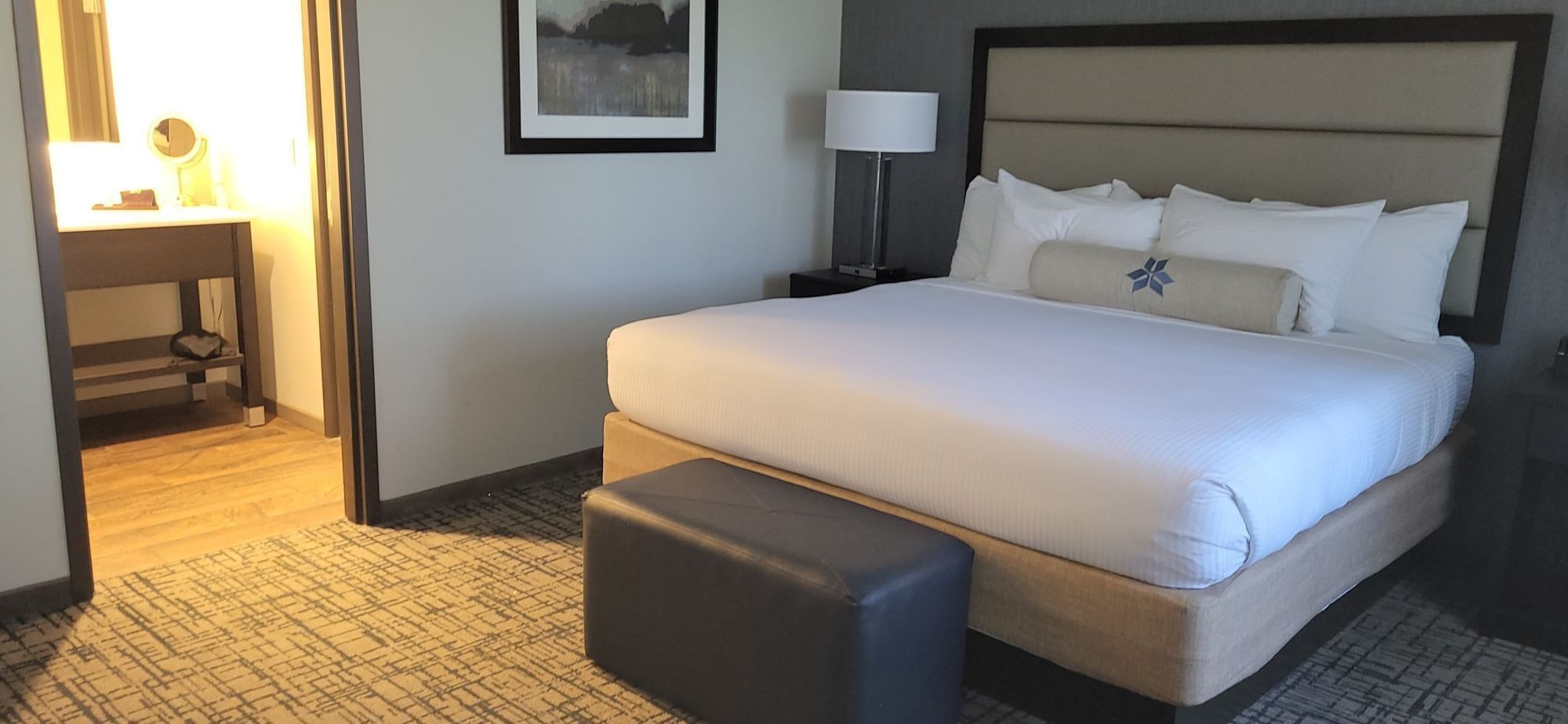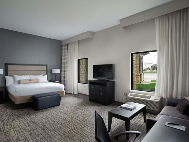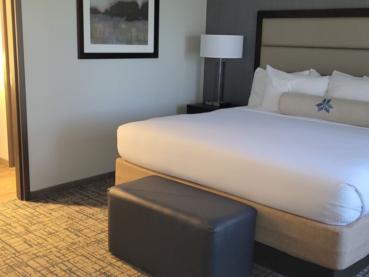Invite guests over for dinner or cocktails in this spacious, luxury suite featuring a comfortable living area with sofa and chair, a convenient kitchen area and dining bar. The separate bedroom features a king size bed with work desk and spacious guest bathroom with modern amenities...