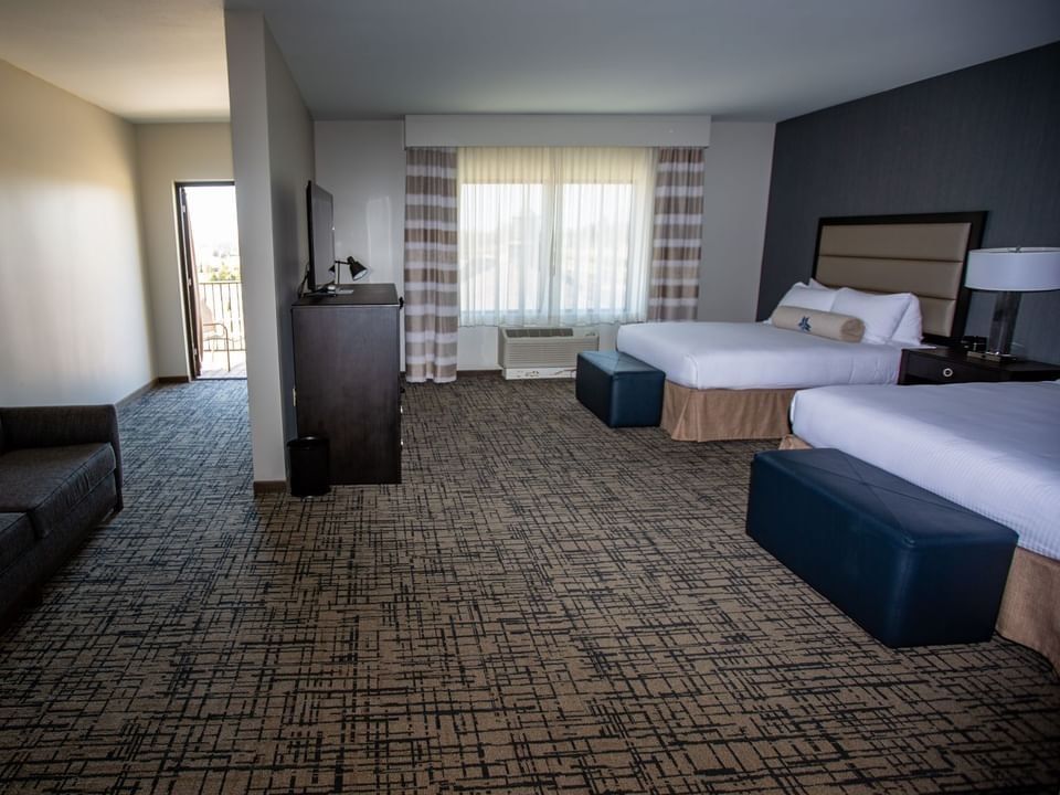 Enjoy comfort in this stylish guestroom featuring two queen-sized beds, a spacious sitting area, a balcony, a flatscreen HDTV, work desk, and a lavish guest bathroom with modern bath amenities.