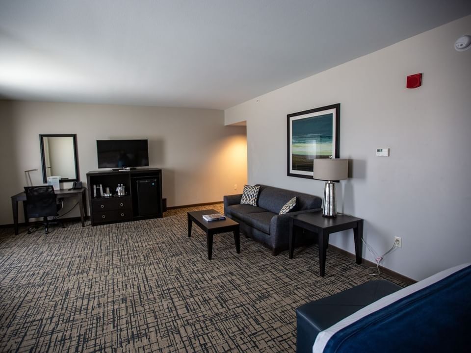 Relax in this stylish guestroom featuring a king-sized bed, a pullout sofa bed and living area, a flat-screen HDTV, work desk, and a spacious guest bathroom with modern bath amenities.